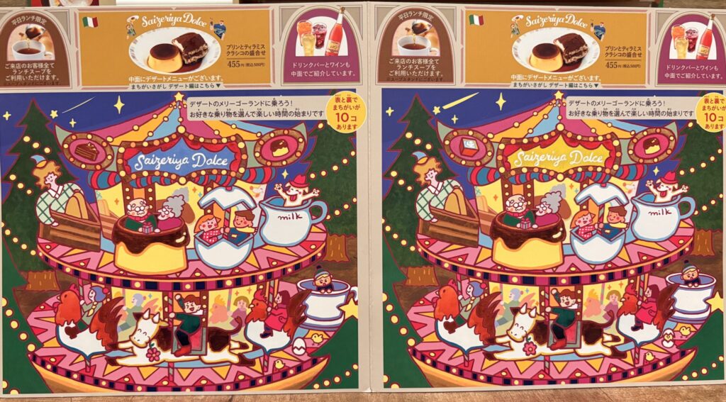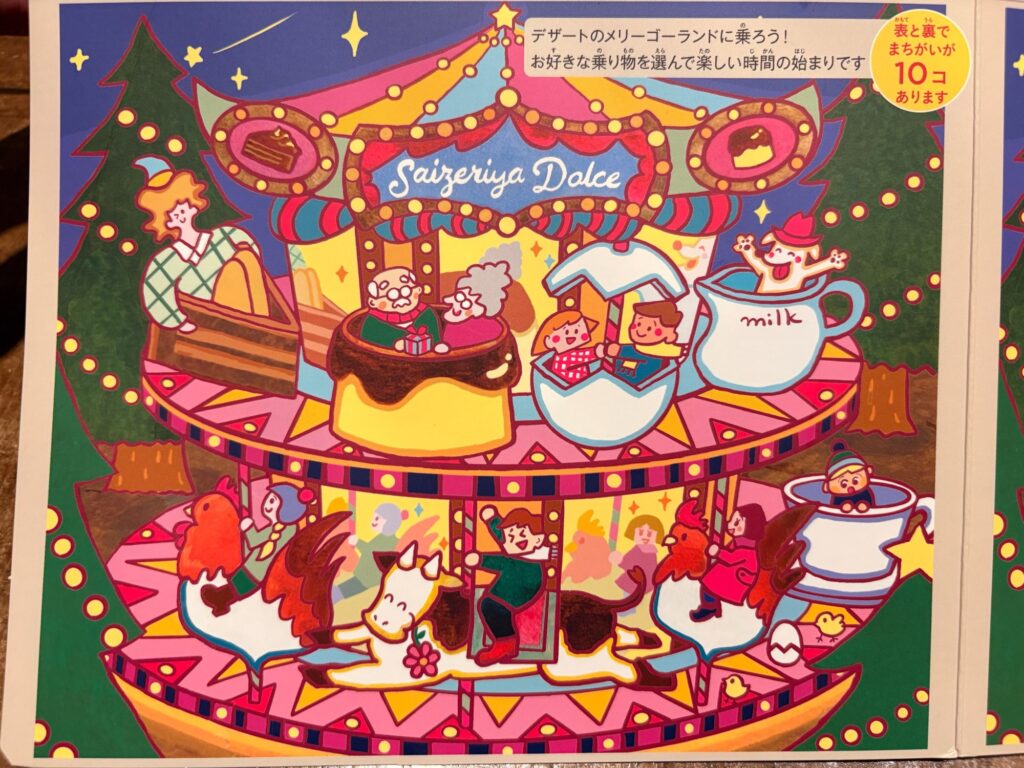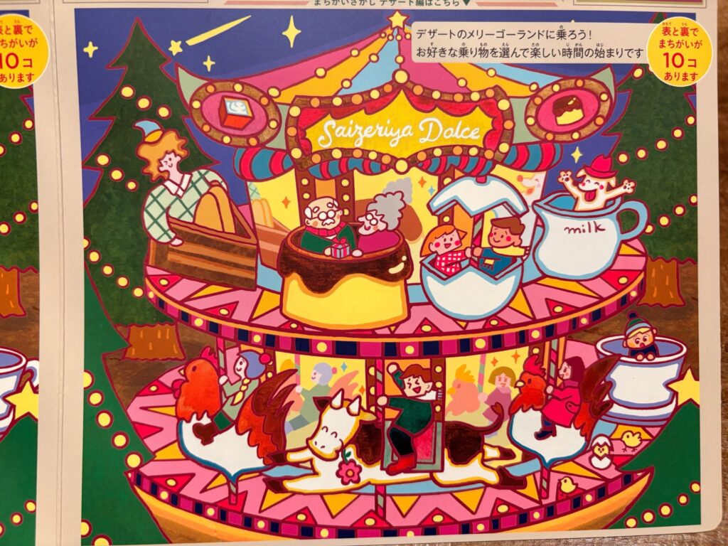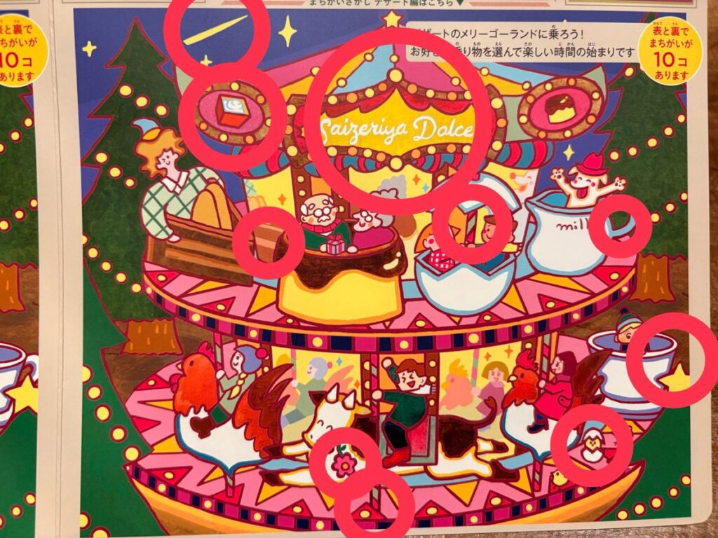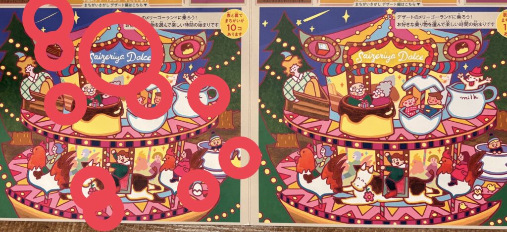 先日、サイゼリヤでいつものように間違い探しを楽しんで、問題を解いてきたので回答をのせておきます。(2025年10月15日分)